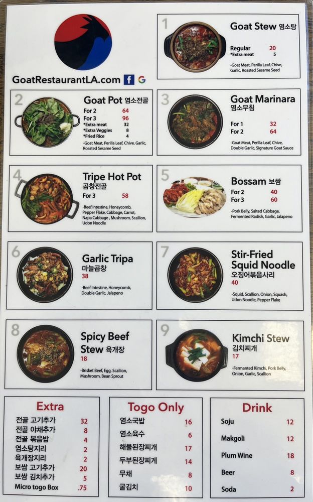 Goat Restaurant in Los Angeles offers a unique experience for those looking to indulge in Korean cuisine. With a menu that includes dishes like black goat soup and garlic intestine, this restaurant is known for its delicious Korean soul food. Customers have raved about the freshness and taste of the goat suyuk (boiled goat) and the generous portions that leave you feeling satisfied. The friendly staff and clean, bright atmosphere make dining at Goat Restaurant a pleasant experience. Don't miss out on the opportunity to try the flavorful goat meat prepared in a way that makes it enjoyable for everyone. Whether you're a fan of Korean cuisine or looking to try something new, Goat Restaurant is a must-visit destination in Los Angeles.