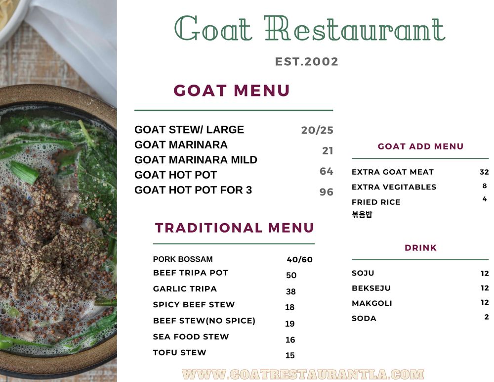 Our signature dish since . A warm and flavorful spiced stew that consists of goat meat, wild perilla leaf, wild perilla seeds, chives, garlic, and scallion. Includes rice, kimchi, radish kimchi, beansprout, and our signature spicy & sour goat sauce. Including +oz Goat Stew +oz Steamed Rice +oz Oyster Kimchi +oz Bean Sprout +oz Spicy Radish +Goat Dipping Sauce 저희 식당에서 제일 많이 찾아주시는 메뉴 입니다.